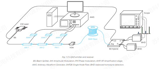 下图给出了连续变量QKD(CVQKD)的一个实例。信息被编码在激光脉冲的振幅和相位中,使用iXblue解决方案:两个强度调制器AM1和AM2与相位调制器PM1级联。