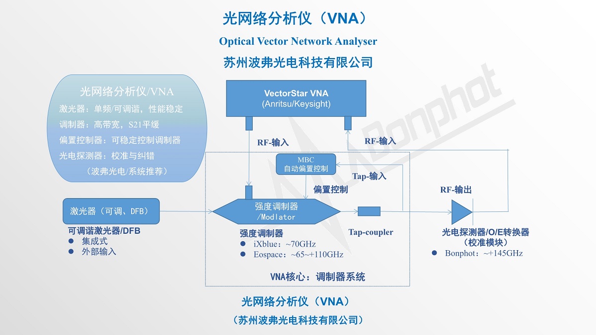 高性能光网络分析仪(VNA)是高速器件参数测试、EO带宽/OE带宽测试、光纤通道&CATV传输系统、射频光纤传输、研究研发等应用常用仪器。苏州威廉体育光电科技有限公司提供基于高带宽电光调制器(iXblue/Eospace),高达70GHz网络分析仪系统元器件,这些器件、性能稳定、高性价比。