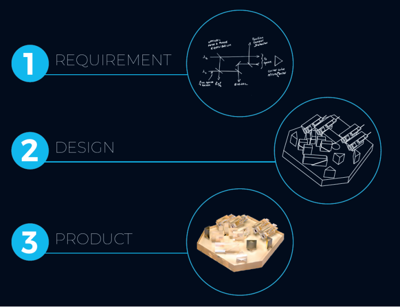 iXblue能够将实验装置集成为工业级的光学模块,从客户要求(简易的草图,下图步骤1)开始,iXblue可以领导或参与完整的产品开发步骤:设计(下图步骤2)、原型机到批量生产(下图步骤3),iXblue的专业技术在于将微光学元件超精确地组装在玻璃基板上,在满足光学性能要求的前提下提供更小的体积,优异的可靠性和稳定性。