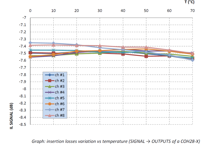 感谢最初为电信行业开发的环氧树脂技术,iXblue器件可以提供稳定、坚固的特性。下图为COH光混频器优异的温度性能,插损随温度的变化极小,满足苛刻环境下的应用要求。