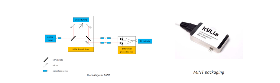 当对传输速率的需求高于Gbit/s时,必须开发新的调制和解调技术。基于自由空间设计和长期的电信技术背景,iXblue能够为这种复杂的解调提供各种产品。其中一系列产品(iXblue MICS系列(超链接),请联系我们提供更多资料)致力于多路复用和解复用,这意味着能够在一根独特的光纤中传输许多不同波长的激光(即40路不同波长的激光束在一根典型的电信光纤中传输,1528至1560 nm,C波段,)。另一系列产品(iXblue MINT系列,见下图)使用光的另一个特性进行解调,即电磁波的相位,相位(0或π)的调制比强度的调制更容易、更快。MINT产品使光学DPSK(差分相移键控)解调成为可能,它适用于大约10 Gbit/s的更高传输速率。(MINT:延迟线干涉仪,DPSK解调器)