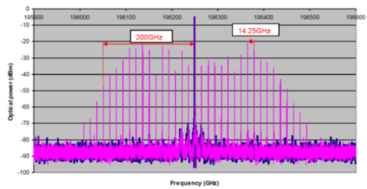 基于铌酸锂电光调制器所产生的光学频率梳,原理是通过铌酸锂相位调制器(Phase Modulator),铌酸锂强度调制器(Intensity Modulator)的边带产生(参考微信公众号:使用电光调制器实现边带调制),通过串联铌酸锂相位调制器、强度调制器实现高平坦度(~2dB),多梳线光学频率梳产生,最终产生上百个梳线的频率梳。基于铌酸锂调制器产生的光学频率梳具有中心频率已于调节,重复频率可控等优势。