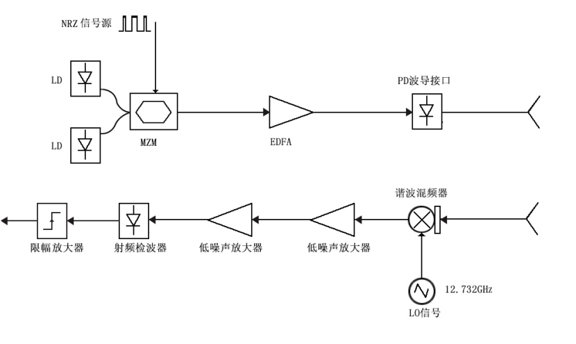 太赫兹频段由于其宽带特性,在通信、雷达、特征频谱检测等领域具有巨大应用潜力。为了使短距离无线通信的数据速率达到10Gbps,利用光电结合技术以THz波段(125GHz)为载波,建立太赫兹无线通信系统。如下图所示使用62.5GHz信号调制光波,通过平面分波电路产生相隔0.125THz光信号,此光信号受发射数据的调制,然后进入PD,进行光电转换,产生0.125TH组的调制波,经过放大后馈入天线发射,接收端经天线后进入低噪放,检波成基带信号,经过放大,数据恢复。