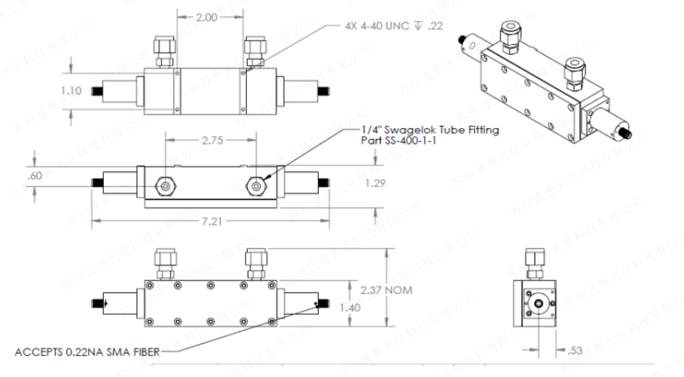 1.流通池有四个安装孔,底部有4-40螺纹。