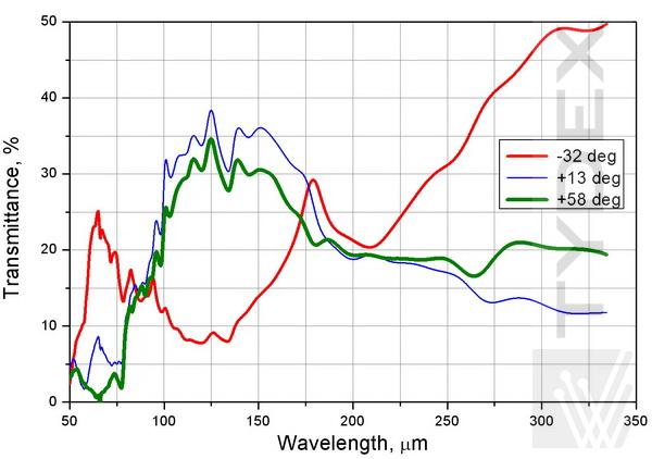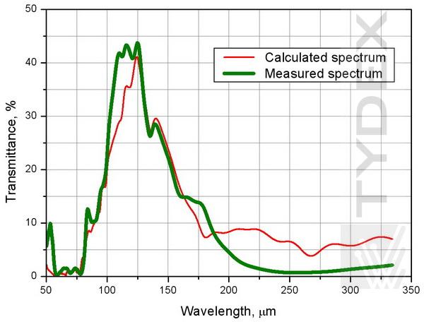 1. TWPC作为半波单色板,适用于80-160μm范围内的任何波长。TWPC作为120 μm半波片进行了测试。图1显示了使用平行偏振器计算和测量的TWPC透射光谱的比较。在120 μm处几乎为零的透射率证实了在所选波长处的适当偏振转换。