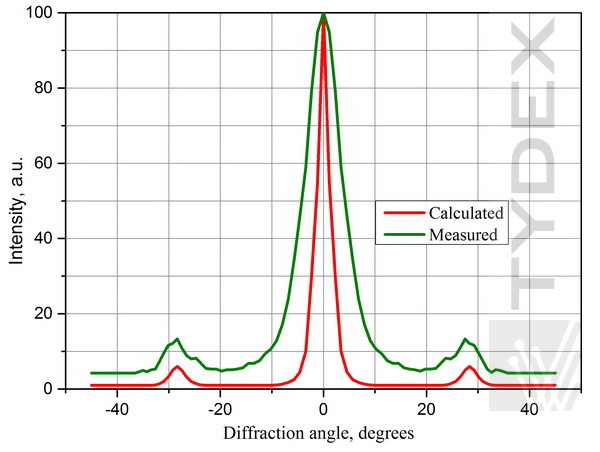 为了验证操作并比较计算参数和实际参数,在具有不同太赫兹辐射源的各种光学布置中测量了光栅的特性。使用了两个来源。第一个是 FIR 激光器,一种由可调谐 CO2 激光器(彼得大帝圣彼得堡理工大学)光学泵浦的亚毫米甲醇蒸汽激光器。第二个是 FEL,一种自由电子激光器(西伯利亚同步加速器和太赫兹辐射中心,Budker 核物理研究所,RAS)。图 3 和图 4 描绘了当 FIR 激光用作辐射源时,间距 d=250 μm 的 TPX 和 ZEONEX 光栅的单色波强度 (λ=118 μm) 与衍射角的关系。图 5 和 6 给出了由 FEL 照射的相同光栅的单色波强度 (λ=141 μm) 与衍射角的关系。在第二种情况下,会聚透镜放置在光栅和辐射传感器之间。这些图的比较表明,在第一种情况下,零阶最大值和一阶最大值比透镜排列更宽。这是由于会聚透镜聚焦平行光束。用户在根据自己的意图设计实验时必须考虑到这一点。当光栅用于研究辐射源的特性(功率、光束形状、能量分布等)时,透镜是多余的。但是当需要解析谱线时,镜头就变得很有必要了。