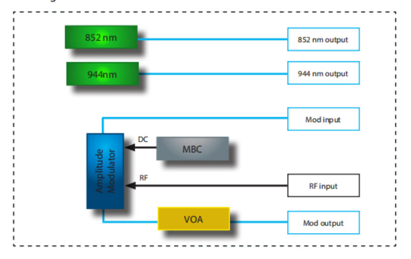 • 内嵌两个激光源,一个852 nm和944 nm低RIN DBR激光器。为了便于使用,省略了一根外部接插线,将激光输出连接到调制器输入光端口。波长和功率可通过前面板控制或ModBox软件接口进行调整。